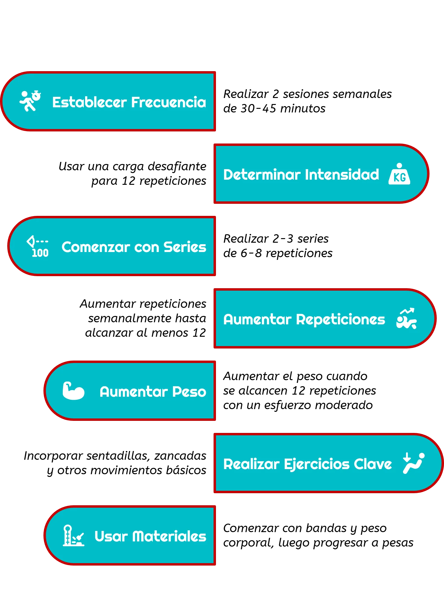 Intenta aumentar una o dos repeticiones por semana. Cuando alcances 3 series de 12 repeticiones con una carga determinada, incrementa el peso o la dificultad y vuelve a bajar a 6-8 repeticiones.