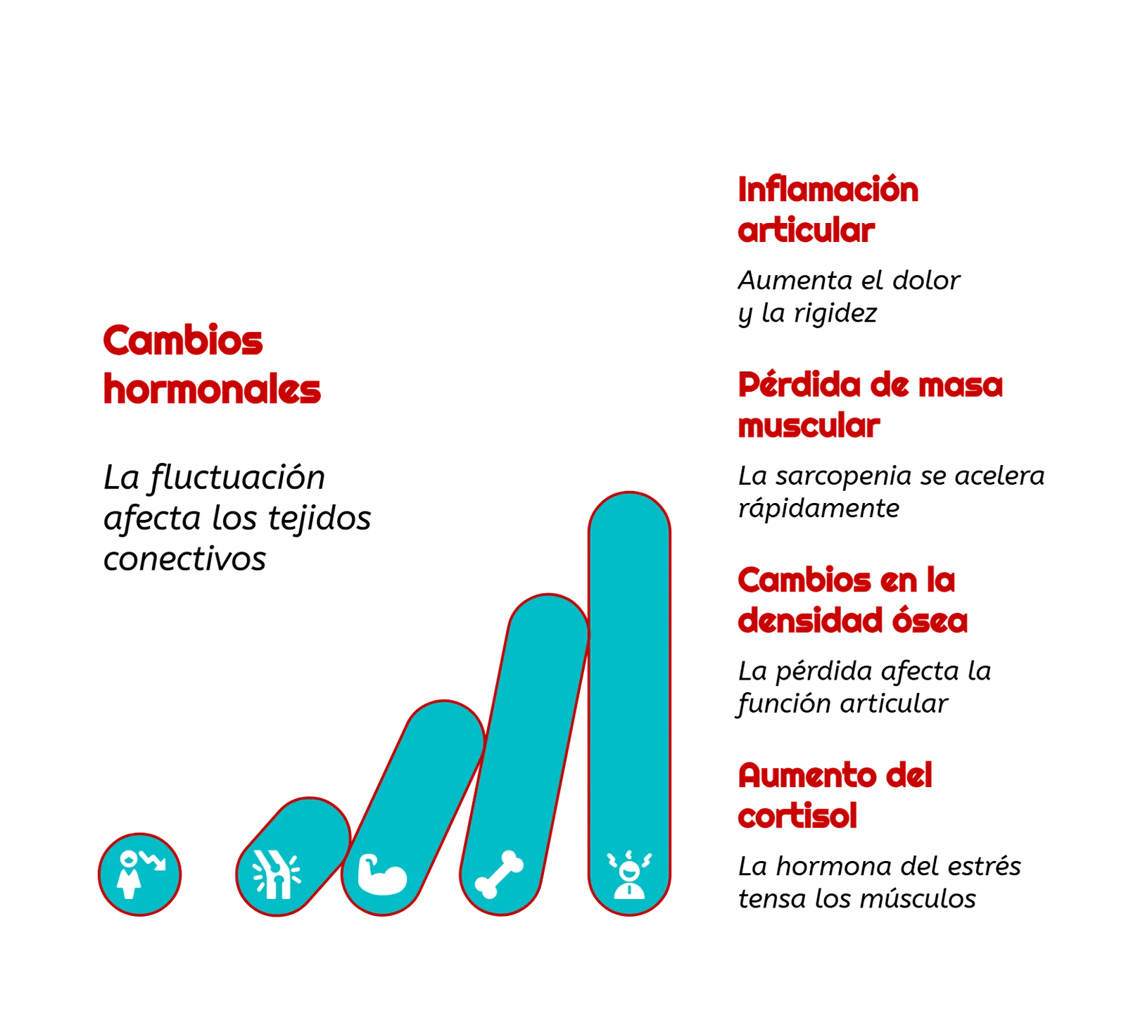 - Pérdida de masa muscular: La sarcopenia se acelera, generando debilidad y mayor riesgo de lesiones