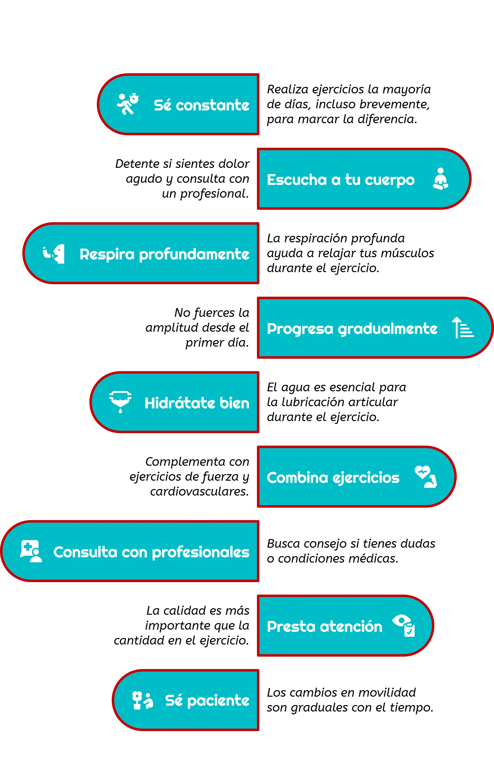 - Escucha a tu cuerpo: Si sientes dolor agudo, detente y consulta con un profesional