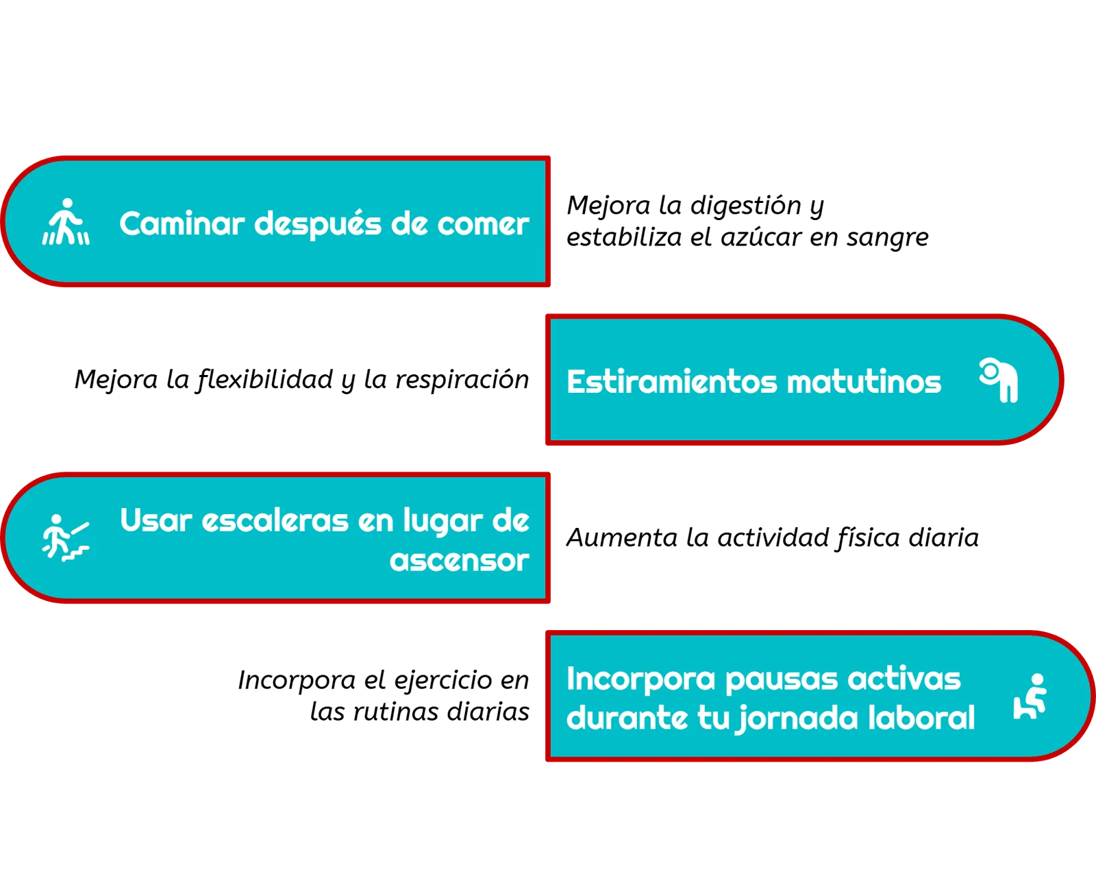 - Escaleras en lugar de ascensor: Aumenta gradualmente la velocidad o cantidad de pisos que subes.