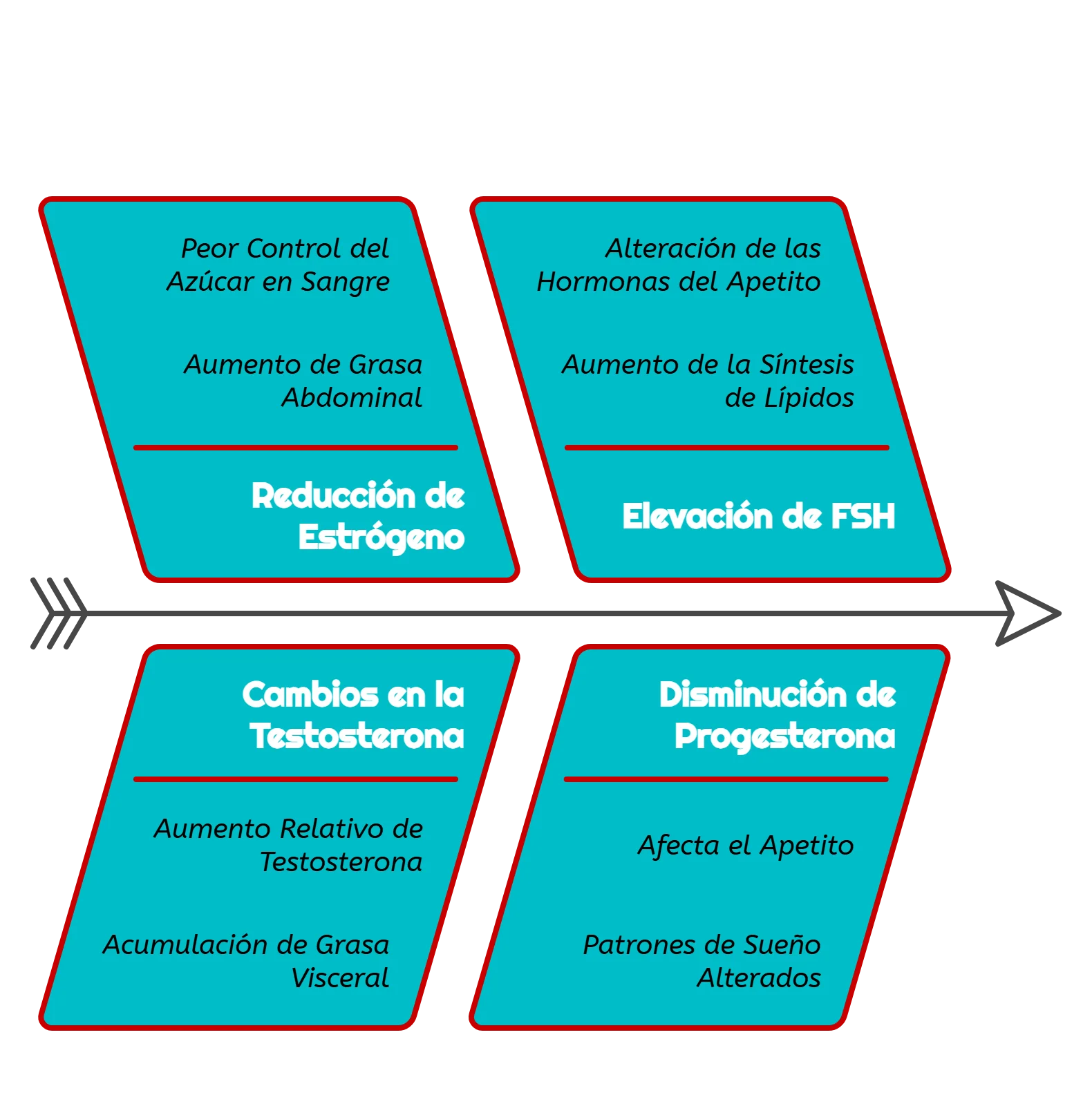 - Reducción del estrógeno: Conduce a un aumento de grasa abdominal, peor control del azúcar en sangre y un perfil de colesterol menos favorable.