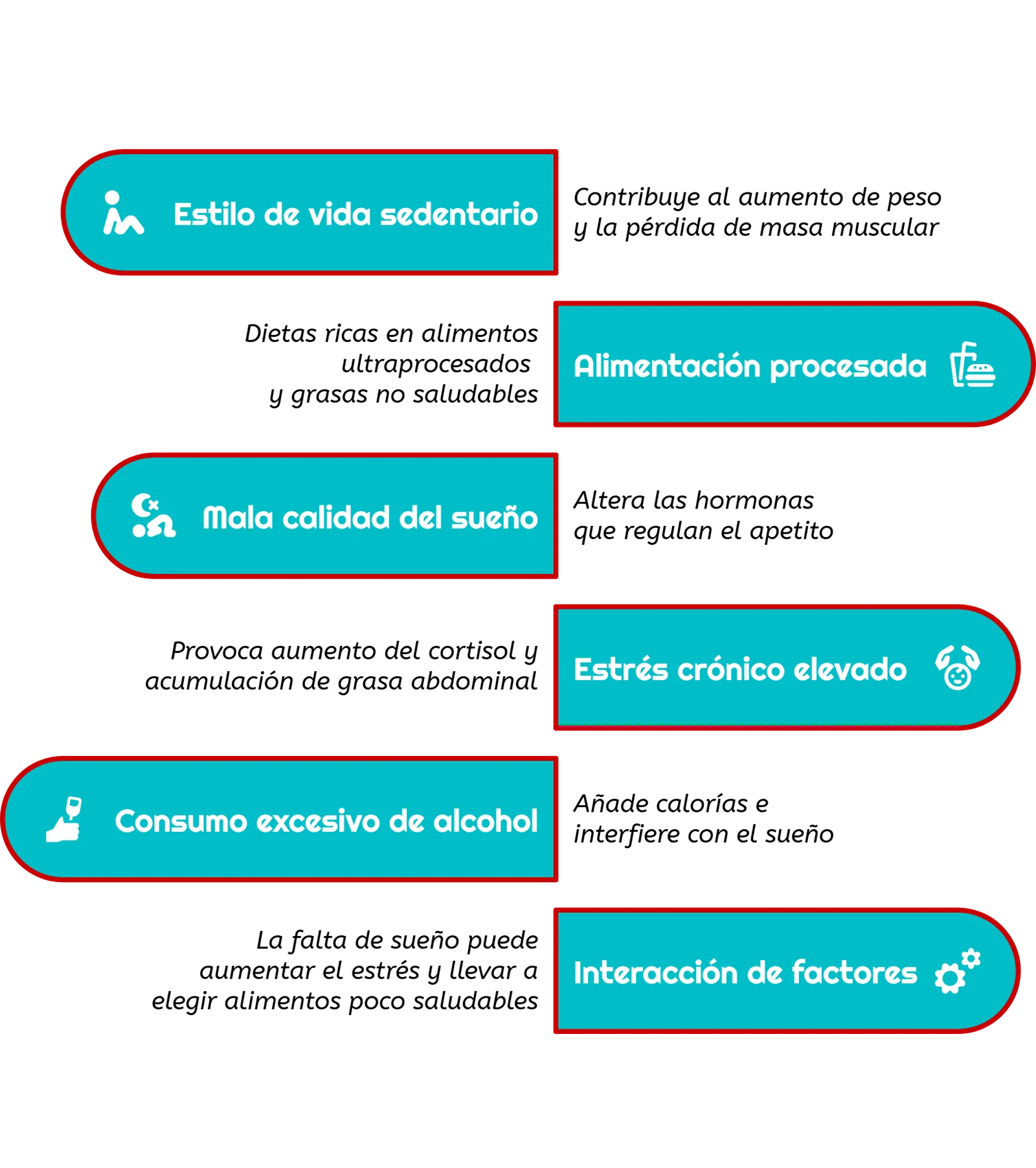 - Estilo de vida sedentario: Contribuye al aumento de peso, pérdida de masa muscular y resistencia a la insulina.